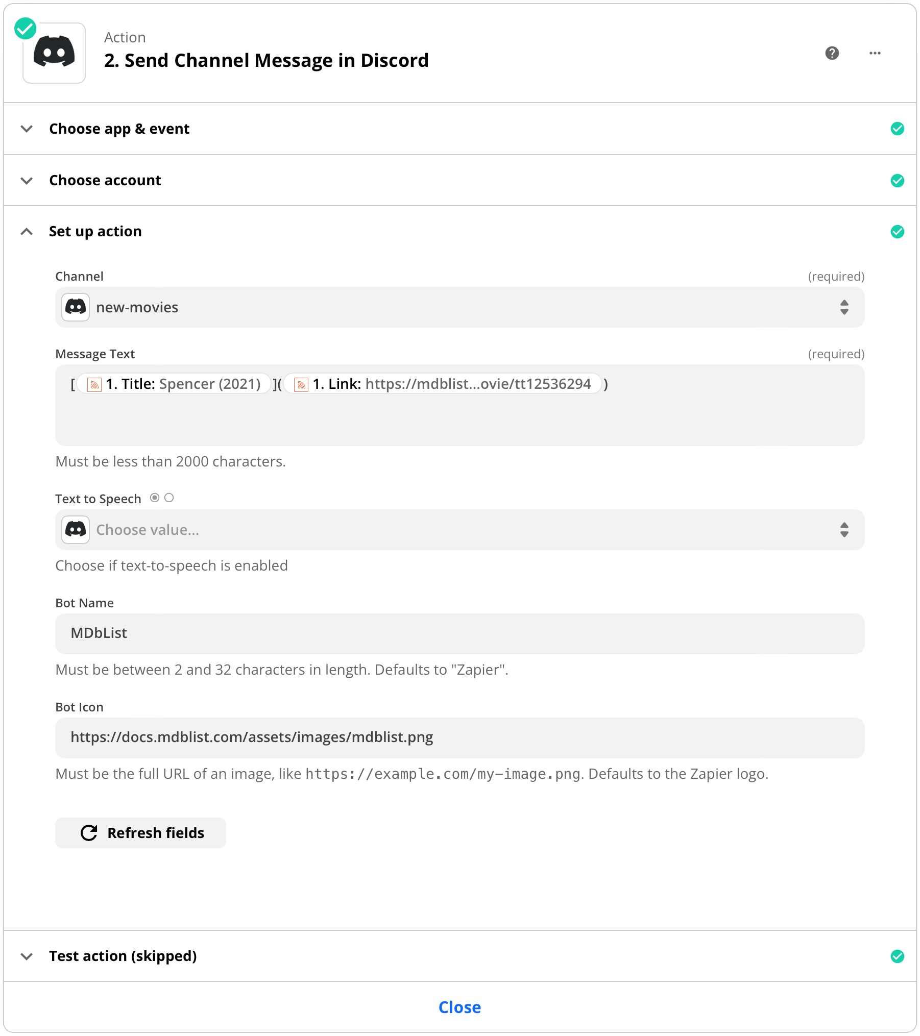 • On the next step, Select a Channel, fill message text as in the screenshot example below and click Continue to Test your created action.