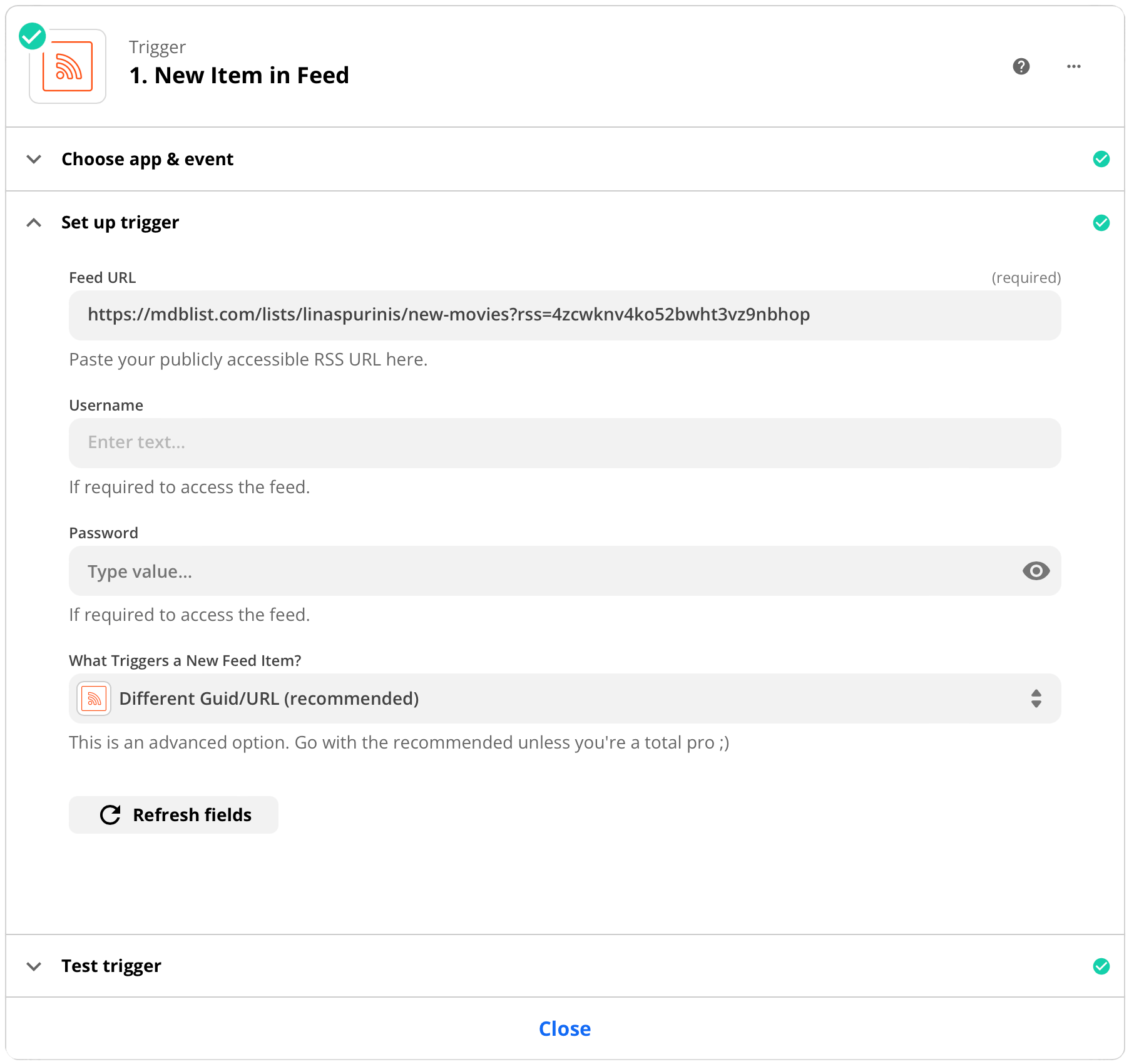 • Click “Test Trigger”. You will see some RSS data parsed by Zapier, click Continue.
